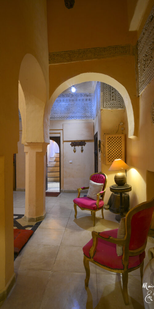 Il est situé au cœur de la médina et à seulement 5 minutes du marché et du centre-ville. La maison a été soigneusement restaurée par son propriétaire espagnol afin de préserver toute son authenticité. En entrant, vous serez accueilli dans un immense salon de 6 mètres de haut, orné d’une coupole dorée, qui donne accès aux différents espaces de la résidence. Parmi les différentes pièces, vous pourrez découvrir :