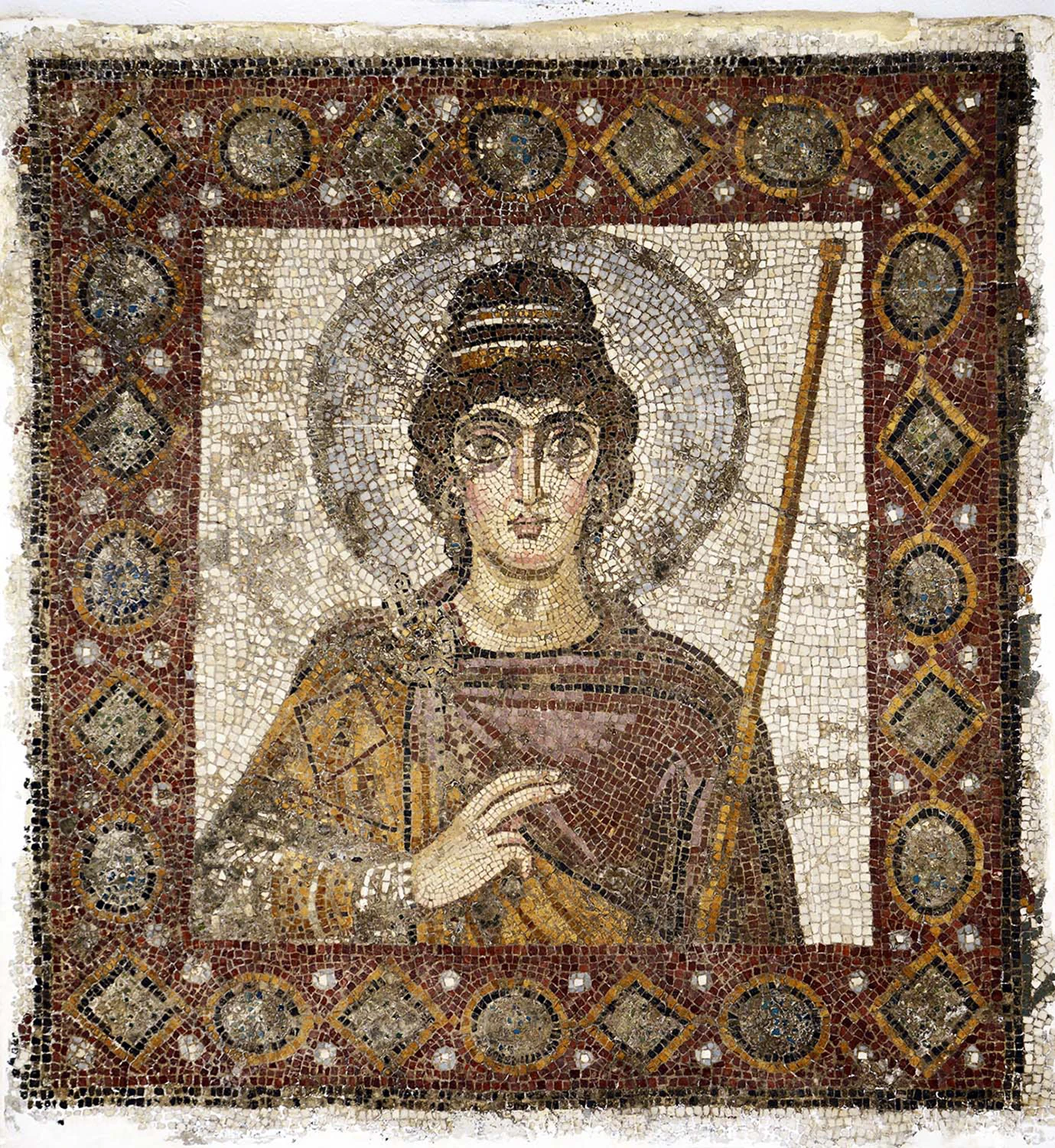 Elle est habillée avec une sous-tunique, une tunique et un manteau (“paludamentum”), porte un long sceptre doré surmonté d’un globe et une auréole brille derrière sa tête.