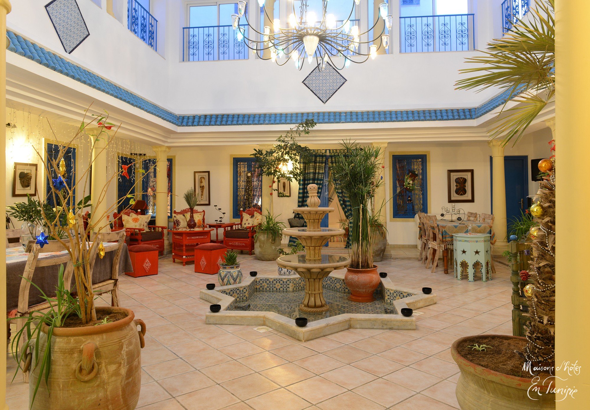 Des années de bonheur s’annoncent. Dominique, en guise de remerciement à Sidi Aïssa et aux lieux, repeint chaque année jusqu’à ce jour, au moment du Ramadan le dit marabout. Merci ! D’architecture moderne d’un menzel revisité, Villa Zembra, 1ère maison d’hôtes du Cap bon, est autrement plus typique à l’intérieur et vous invite au voyage. Le patio est la pièce autour de laquelle s’articule la vie de cette magnifique demeure. Une fontaine de Dar Chabânne en pierre taillée trône au cœur du patio. Un grand lustre en fer forgé donne de la hauteur à l’espace que plusieurs salons multicolores habillent.